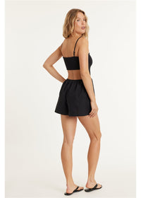The Shore romper features a woven fabric design with a smocked bodice that includes stylish cutouts, complemented by convenient front porkchop pockets for added functionality.