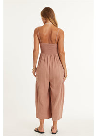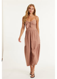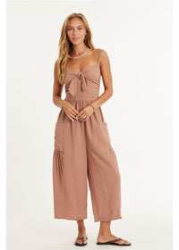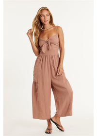 The Sunset Dreamer woven jumper features a stylish knot front, a smocked back for a comfortable fit, and spacious side pockets for convenience.