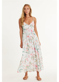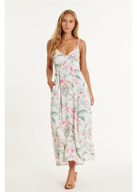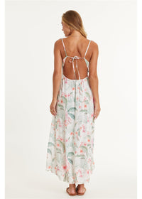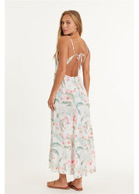 This woven maxi dress features a vibrant print, flattering princess seams, convenient side seam pockets, and an elegant open tie-back design. Perfect for making a stylish statement with comfort and ease.