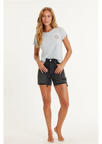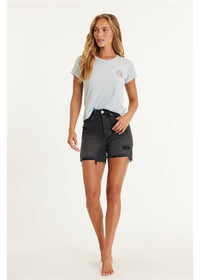 The Bella Denim Short is a high waisted mid length rigid denim five pocket short. It features a raw edge hem and distressing throughout.