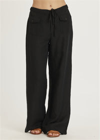 Indulge in the comfort and style of MY FAV WOVEN PANT, featuring a linen material and convenient front flap pockets. The encased elastic waistband and adjustable drawcord add a touch of functionality to this trendy piece.