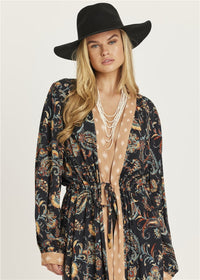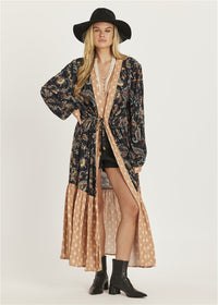 Introducing Zahara, the statement-worthy maxi kimono with a striking contrast printed hem and a stylishly tied front.