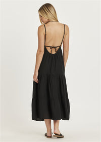 This tiered woven maxi dress is complete with embroidered cups and tie back detail. It will have you saying, "check me out" all day long!