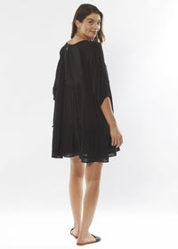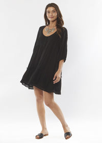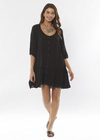 Endless Vacation is a button front peasant dress with tonal embroidery at the neck and hem.