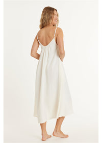 This cotton gauze midi dress features adjustable spaghetti straps, a low back, and side slits at the hemline, combining comfort with a flattering silhouette.
