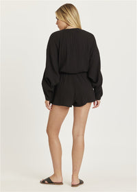 Roll with the tides in this woven long sleeved romper with a button-up front, elastic waistband, and sleeve openings. It's perfect for coasting along and soaking up some sun!