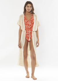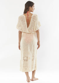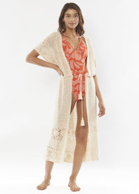 Colette is a crochet kimono with open back and drawcord waist.