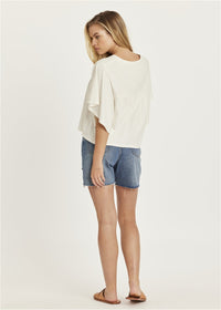 A cozy knit top with fluttery butterfly sleeves, playful front and back yokes, and a curved hemline that adds a touch of whimsy to your wardrobe.