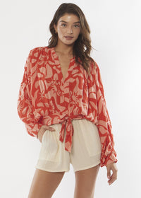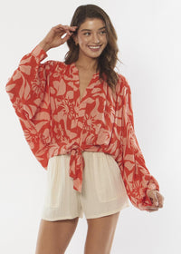 Ticket To Paradise is a dolman sleeve top with tie front.