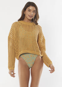 Ahoy Mate is a long sleeve skmmer length open knit sweater.