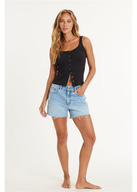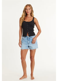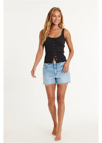This cropped knit tank features a button-front design and a stylish binded finish, perfect for effortless summer style.
